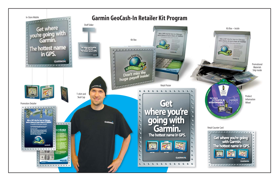 Garmin was looking for a measurable program to push sales through the roof. Developed from the ground up, this campaign consisted of logo, theme, in-store POP collateral, dealer trade ads, direct mail sales kit, a product information wheel, a dealer cash incentive program and geocache program development.