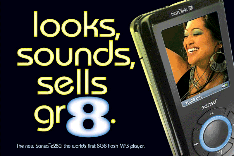 These direct mailers were announced the launch of Sansa e280, the world’s largest capacity Flash MP3 player (at the time). This direct mail campaign precluded the official product release which consisted of national print ads and in-store POP displays. The program was so successful that product was on back order.