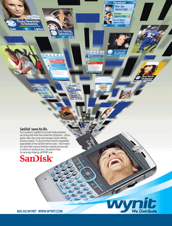 WYNIT, the largest distributor of SanDisk memory cards, wanted to promote SanDisk’s cutting-edge memory cards throughout the cellular electronics industry. This ad was part of a series which ran in national electronic dealer publications and was highly successful for both WYNIT and SanDisk. At SanDisk’s request, enlargements of the ads were supplied for a wall display at their national headquarters in California.