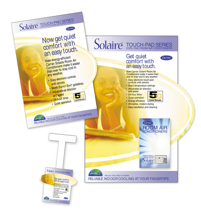 The Carrier Corporation was looking for a complete brand identity campaign to promote their new line of residential room air conditioners. The program consisted of a name and logo, dealer advertisement campaign (print and digital) with local tagging, consumer advertisement campaign (print and digital), a dealer promotional kit, product specification brochures, rack displays, window displays, product packaging and product labeling.