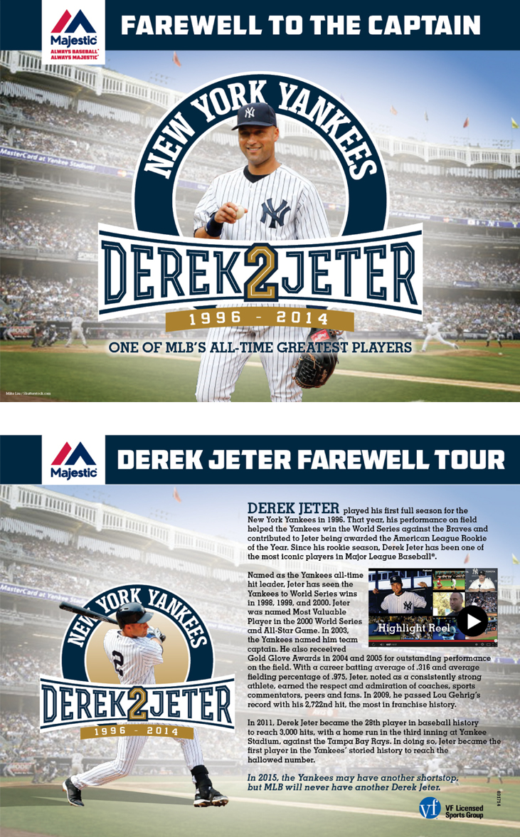 Majestic’s hot-market email promotion is distributed to national and global retailers. This one announced Derek Jeter’s Farewell Tour, included a link to Jeter’s highlight reel and resulted in record sales for 2014. We designed and wrote the copy for this assignment.