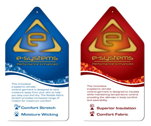 Part of the NFL line for Majestic, E-systems is a trademark developed to promote climate-controlled garments. Through the use of science, one fabric kept the wearer cool and dry while the other provided insulation and warmth. Hang tags served to help consumers identify one from the other.
