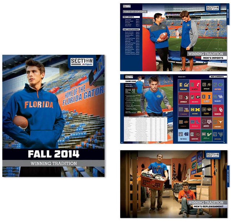 This catalog’s feature team was the University of Florida Gators. Detail pages showed graphics for the remaining universities in a grid format. Images for this catalog were comprised of a combination of location photography and composited images.