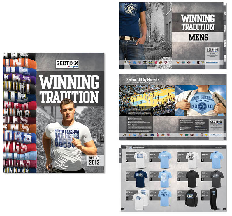 Section 101, Majestic Athletic’s premier college brand, featured custom apparel graphics for nearly 20 universities. Each spring and fall, I was responsible for the concept of design of the catalogs which were distributed to the Majestic sales force. With no in-house photo capabilities at the time, all images were compositions that originated as stock photography.
