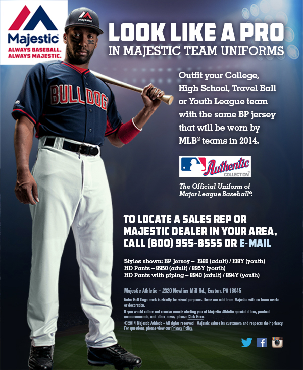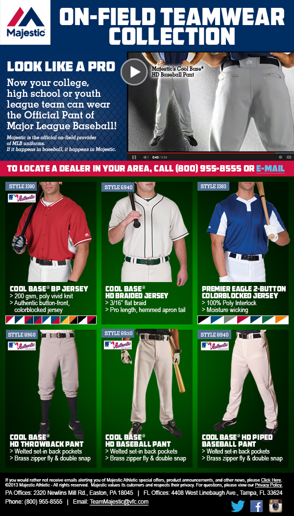 The Team Majestic eBlast program is part of an email distribution program designed to inform youth league managers of new product offerings and promotions. Dynamic ads feature embedded product video and links to social media pages.