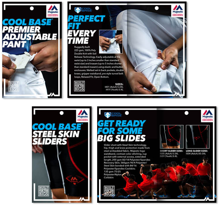 These hang tags were part of a new product launch for Majestic’s youth brand, Team Majestic. Copy described the big-league technology and features which were built into every pair. Tags were card-folded and included a sizing matrix on the back.