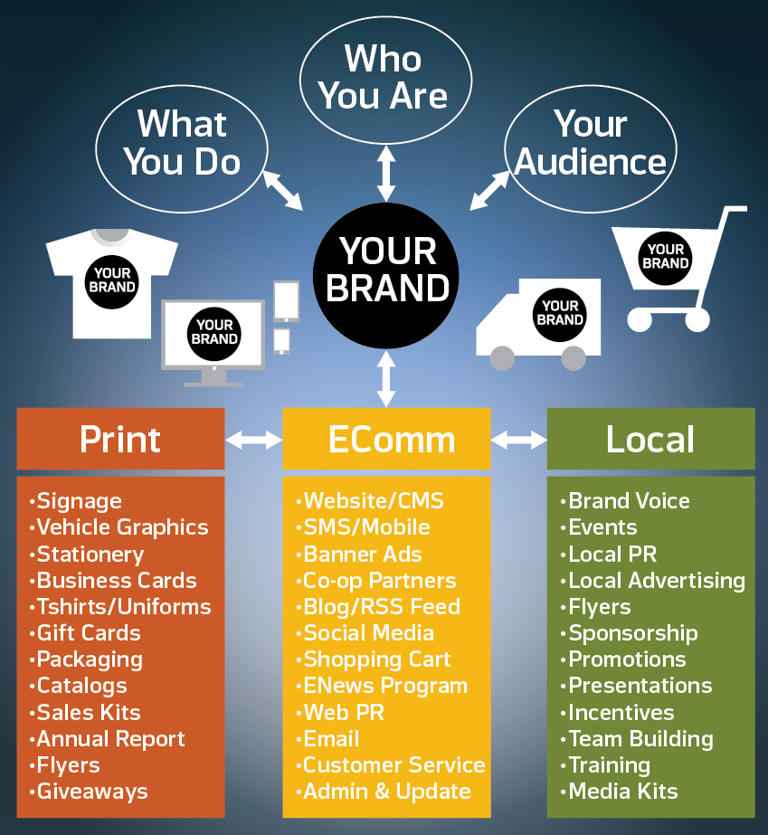 An impactful logo is merely the starting block of a successful brand identity campaign. After all, what good is a logo if no one sees it? A successful branding campaign becomes the vehicle that drives your business forward. Based on your unique business goals, specific target audience, timeline and budget, your brand’s launch is designed to meet customers. For a business owner, it is exhilarating and rewarding to display your brand to the world in the form of a website, signage, social media campaign, vehicle graphics, catalog, t-shirts or whatever vehicles meet your needs. With today’s marketing analytics, you can sit back and watch the results.